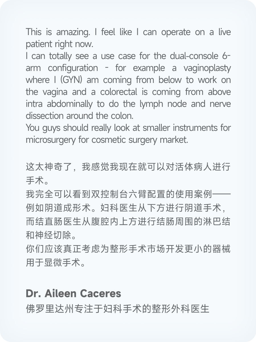 尤其是来自拉丁美洲的外科医生对这台中国的模块化手术机器人兴趣颇深。他们对海山一®特有的5mm直柄器械配置颇为称赞,表示这为他们提供了一种降低手术成本的最佳选择(the straight instrument offering is perfect to reduce cost of surgery)。