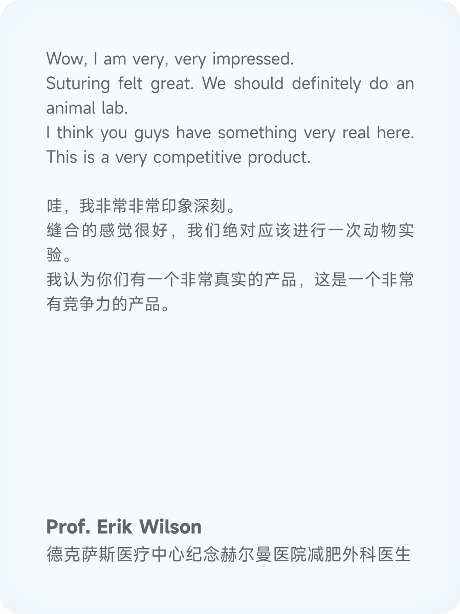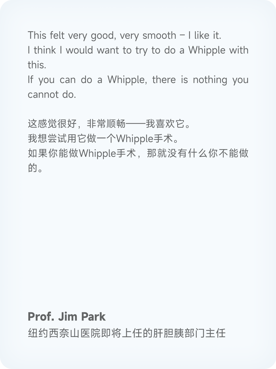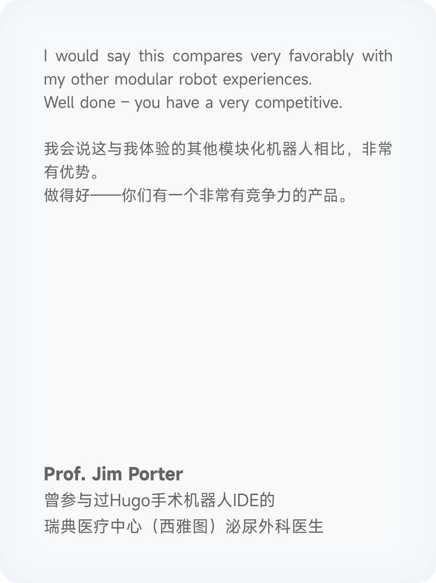 前CMR Surgical首席商务官(CCO)Steve Bell先生在现场试驾了海山一®腔镜手术机器人后,评价道:They have worked hard on 8mm wristed instruments and 5mm straight instruments. They have their own vision system with ICG but can also use other vision systems to reduce cost. It was very nice to see their ultrasonic scalpel already there, so it feels quite complete.