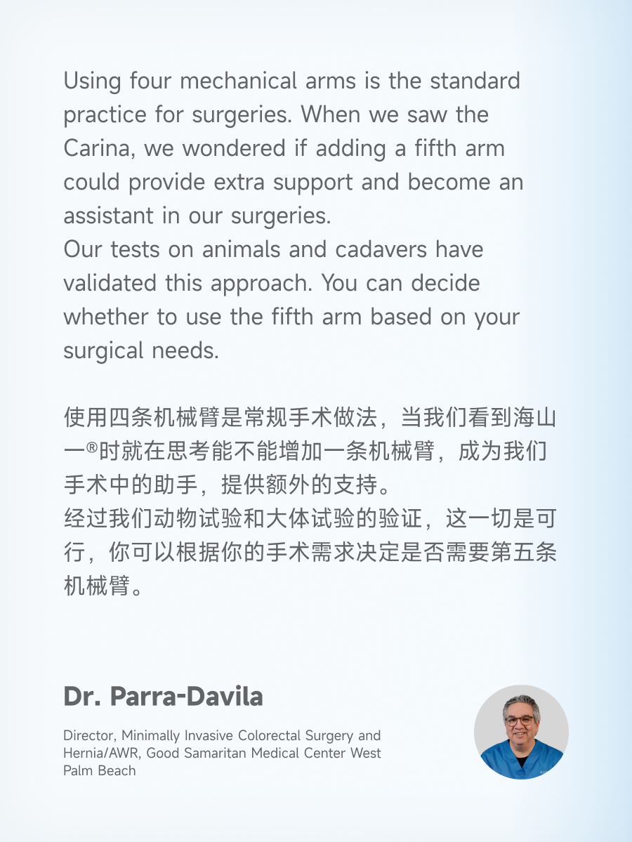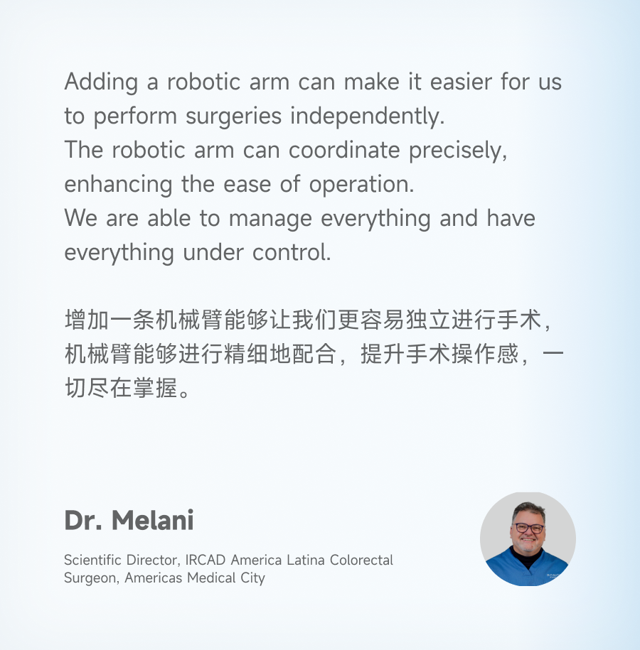 临床的回答更为生动。美国顶尖普外科专家Eduardo Parra-Davila教授和巴西著名结直肠外科专家Armando Melani教授分享了他们使用海山一®腔镜手术机器人进行临床手术的真实感受。